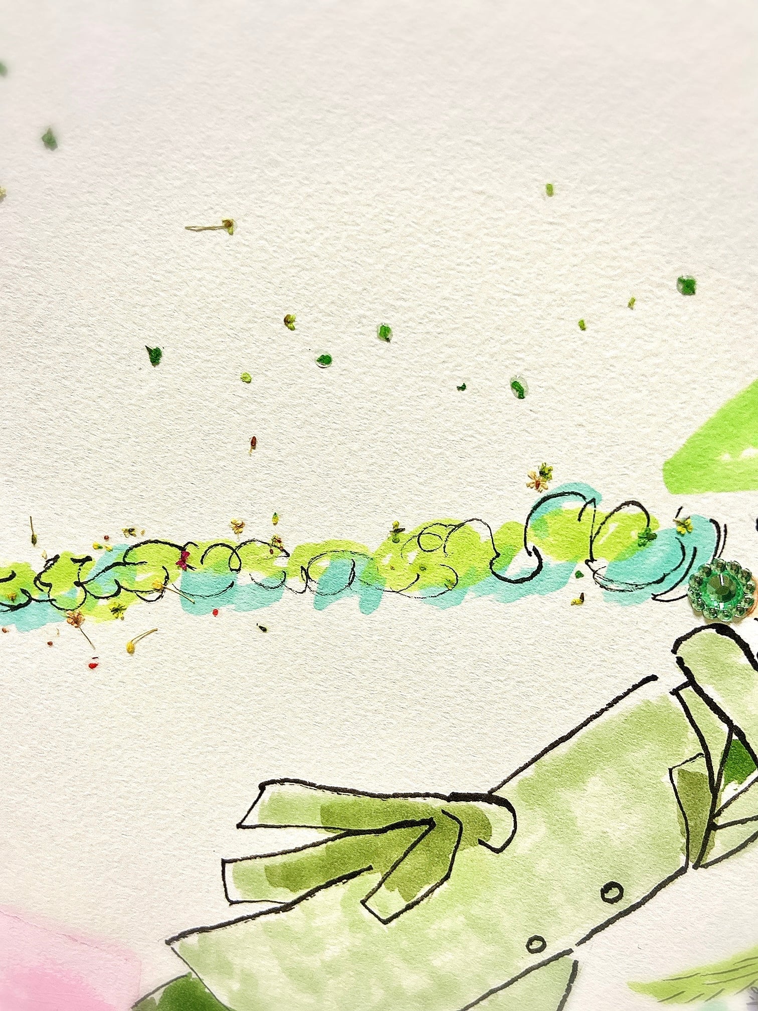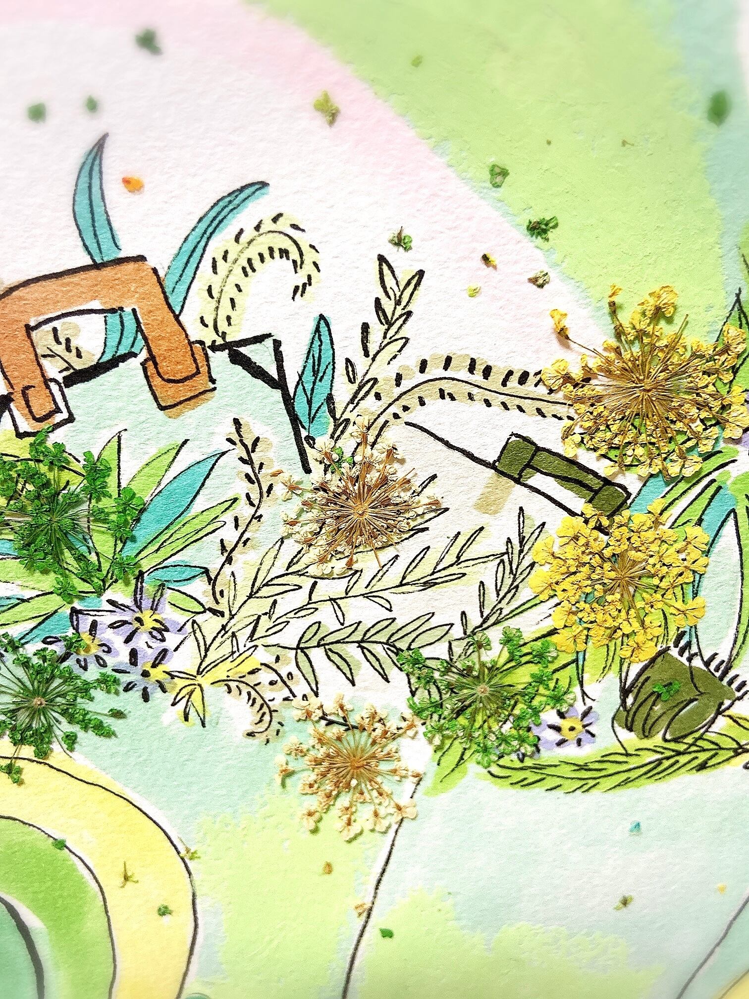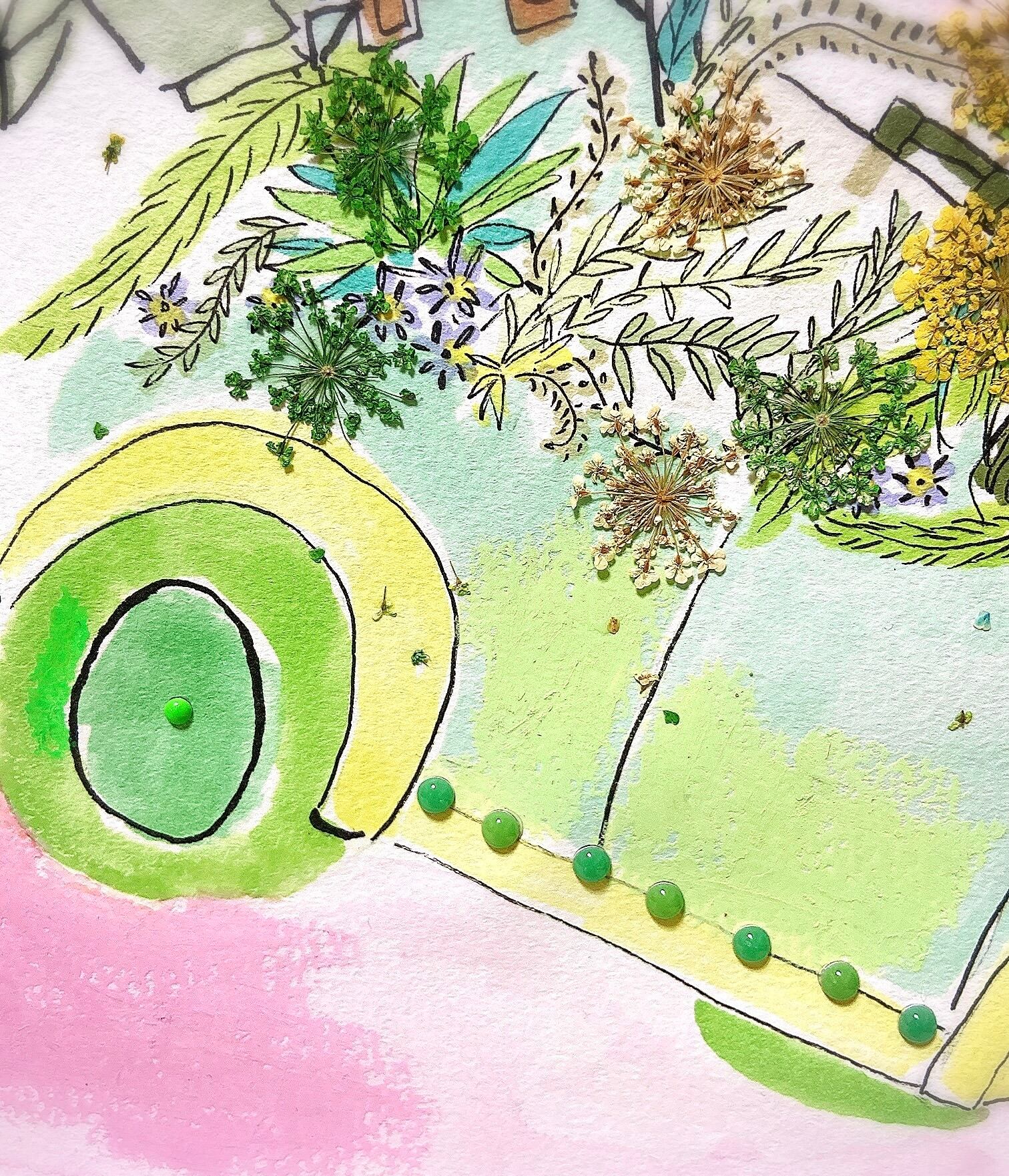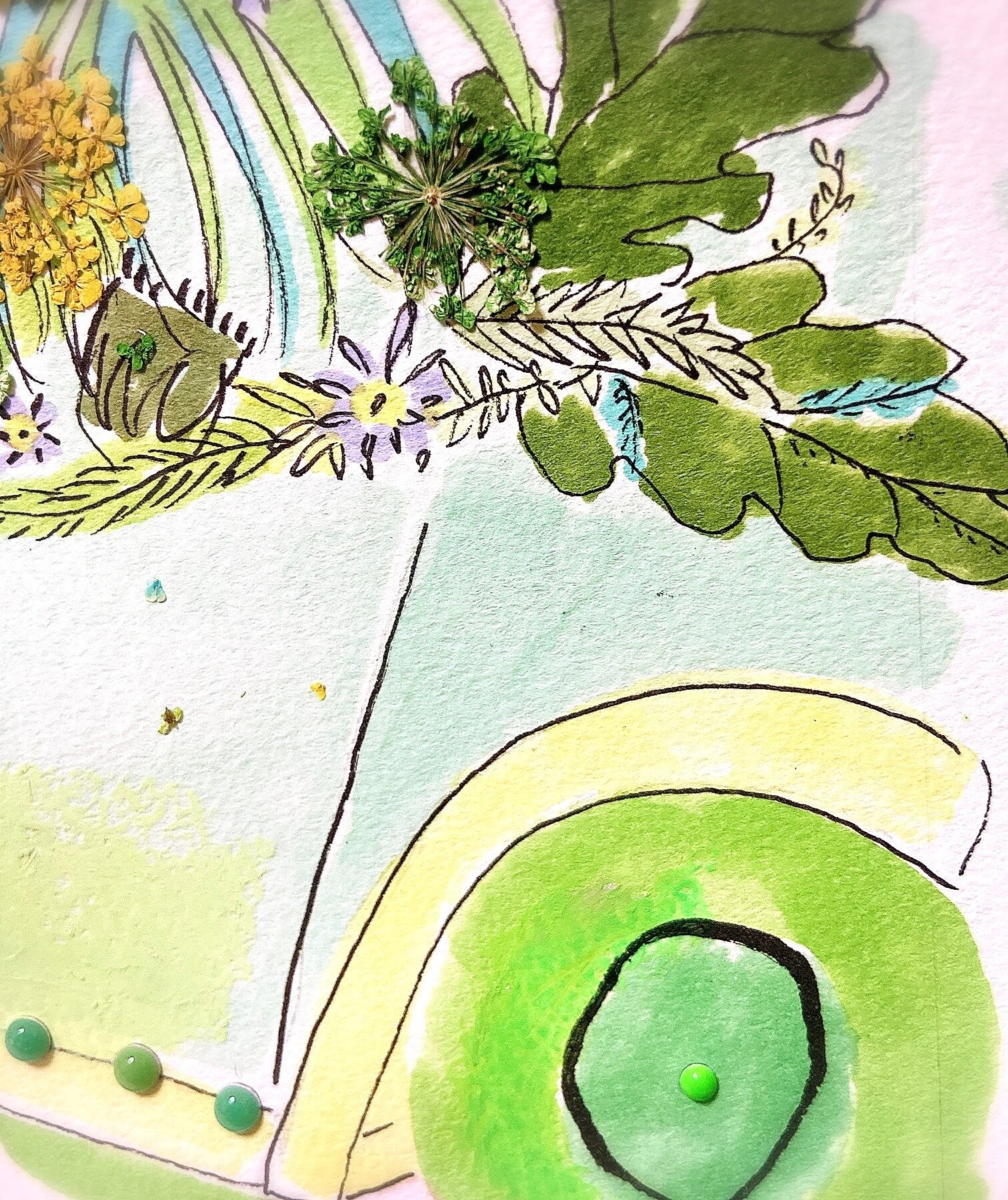 ●マーカー・パステル・スパンコール・ストーン・押し花をコラージュ